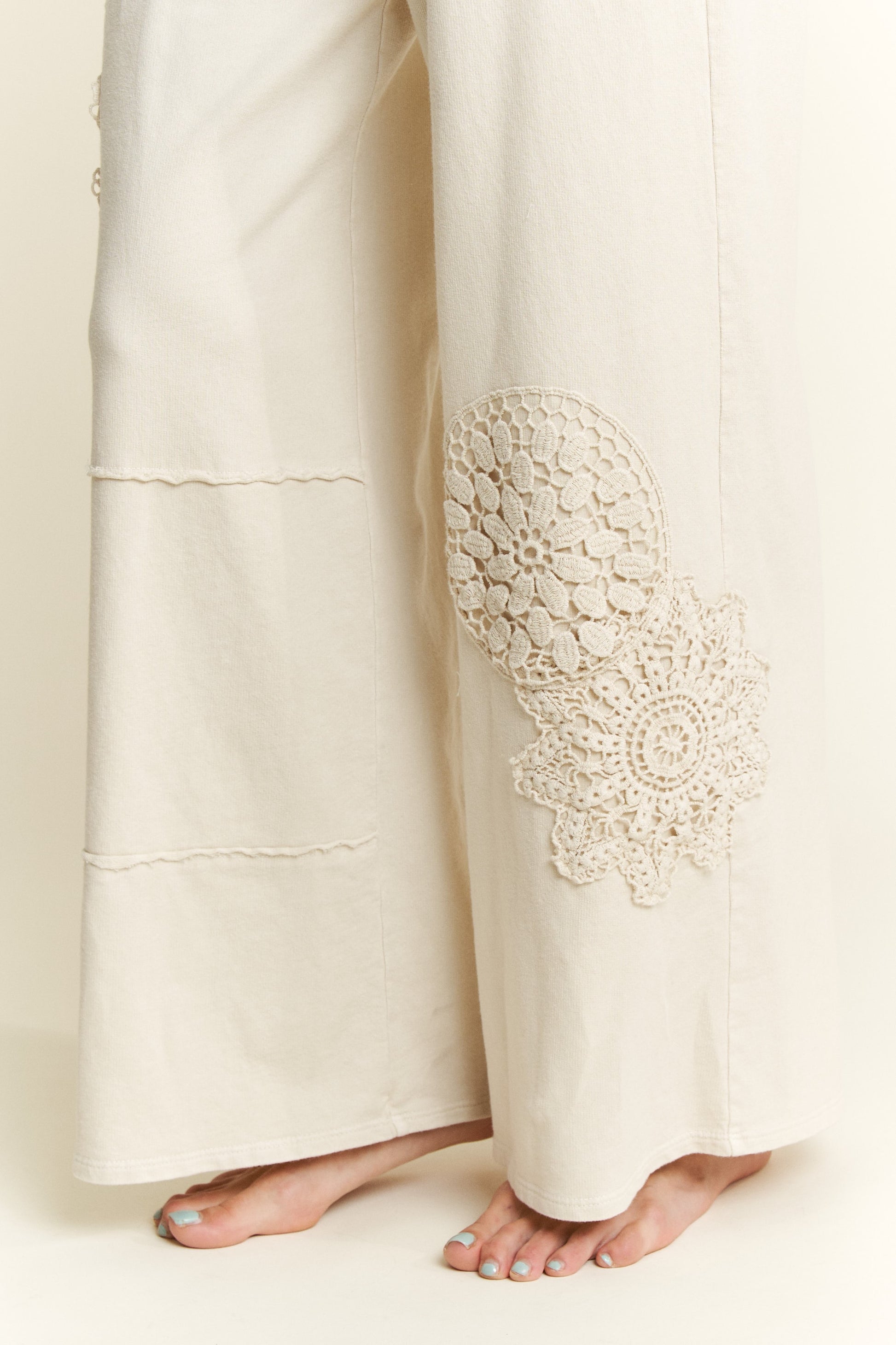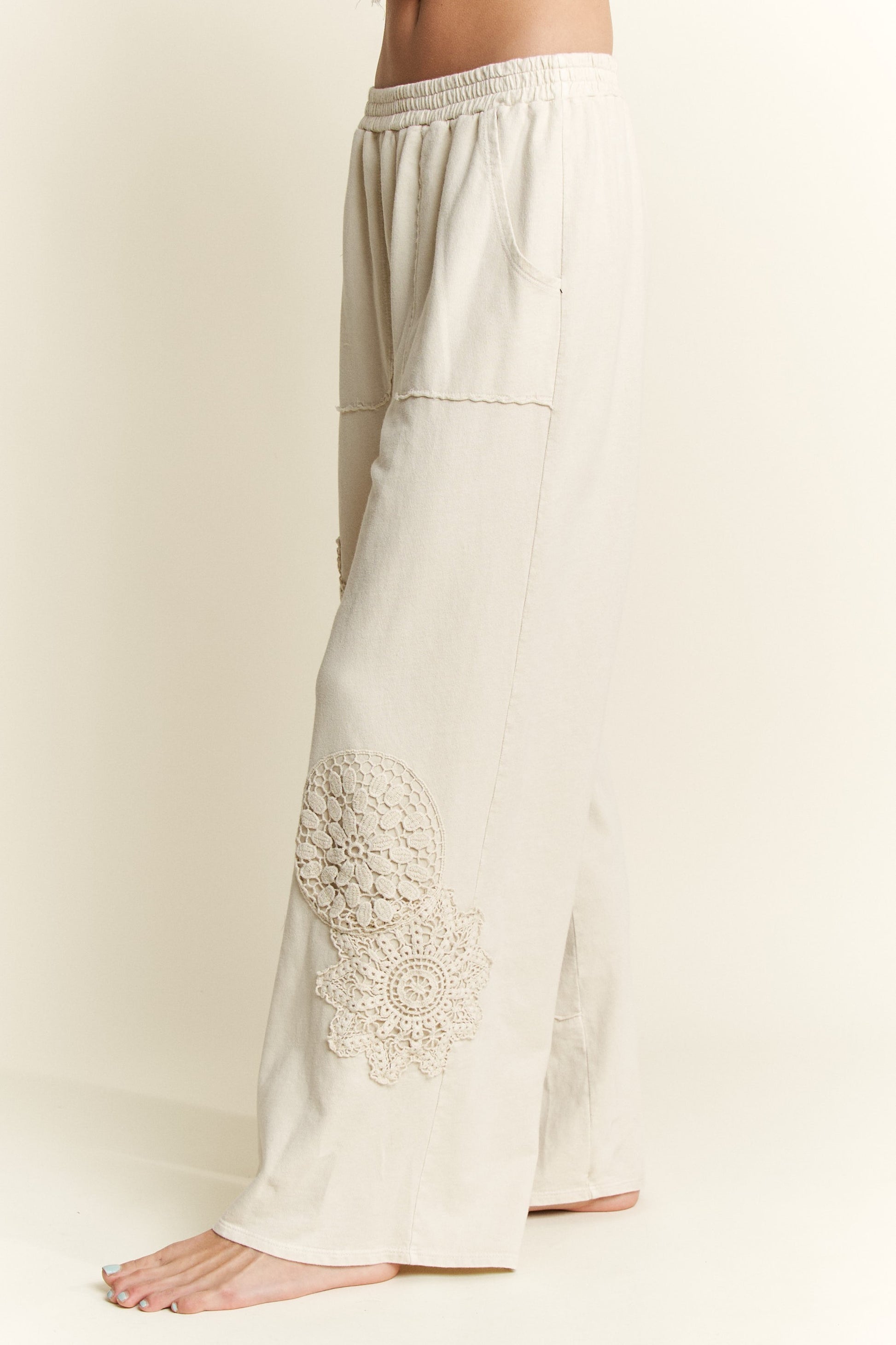 Mineral Wash Lace Cut Wide Leg Pants - Natural