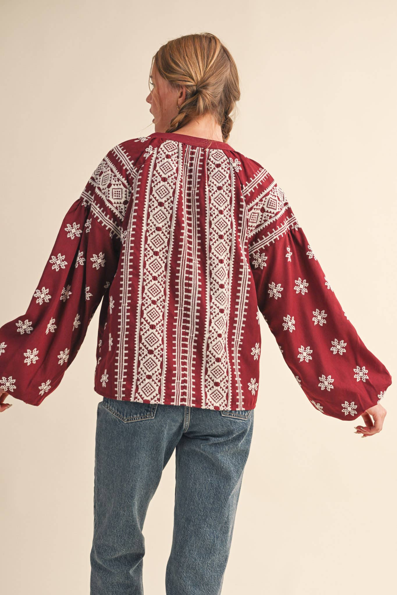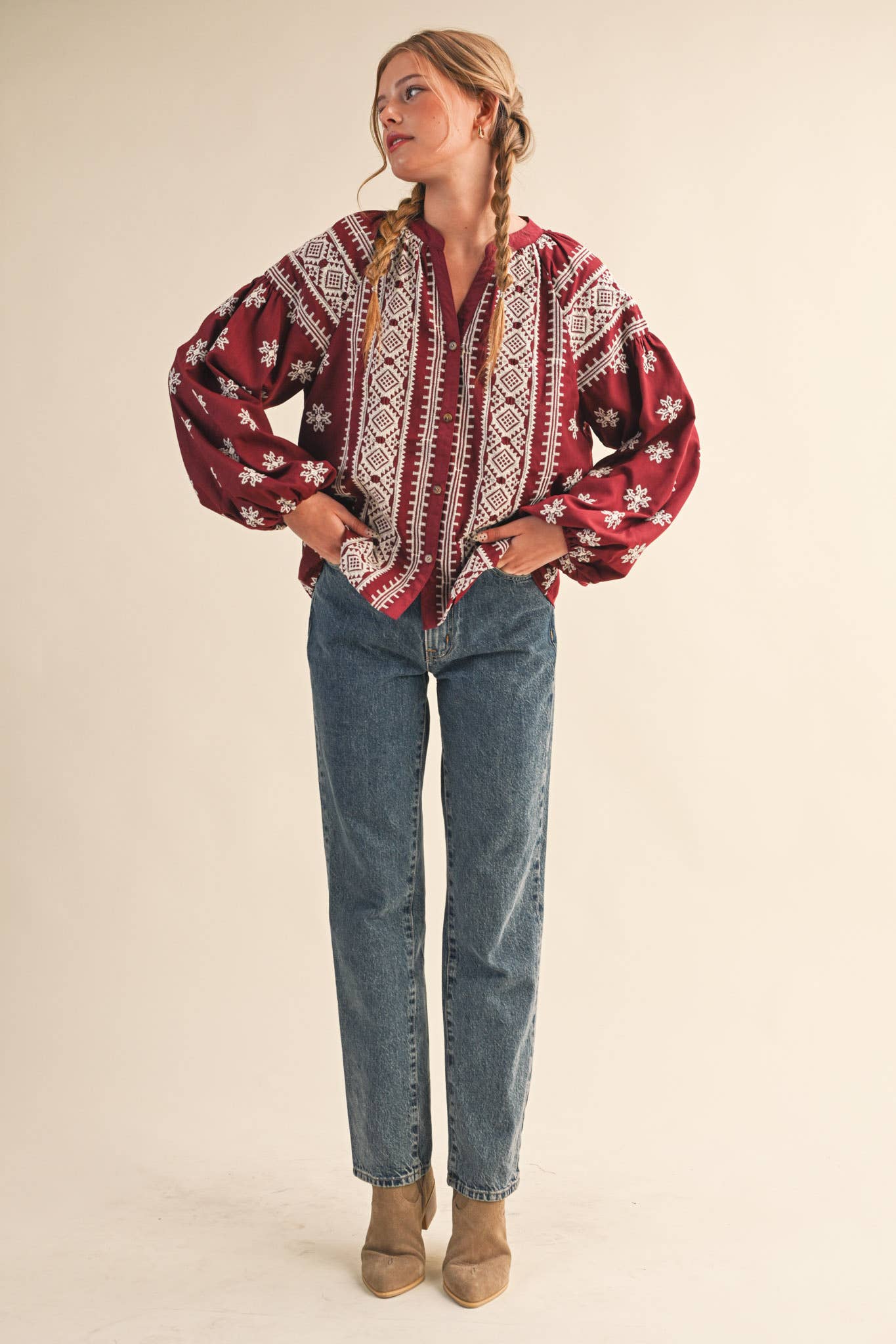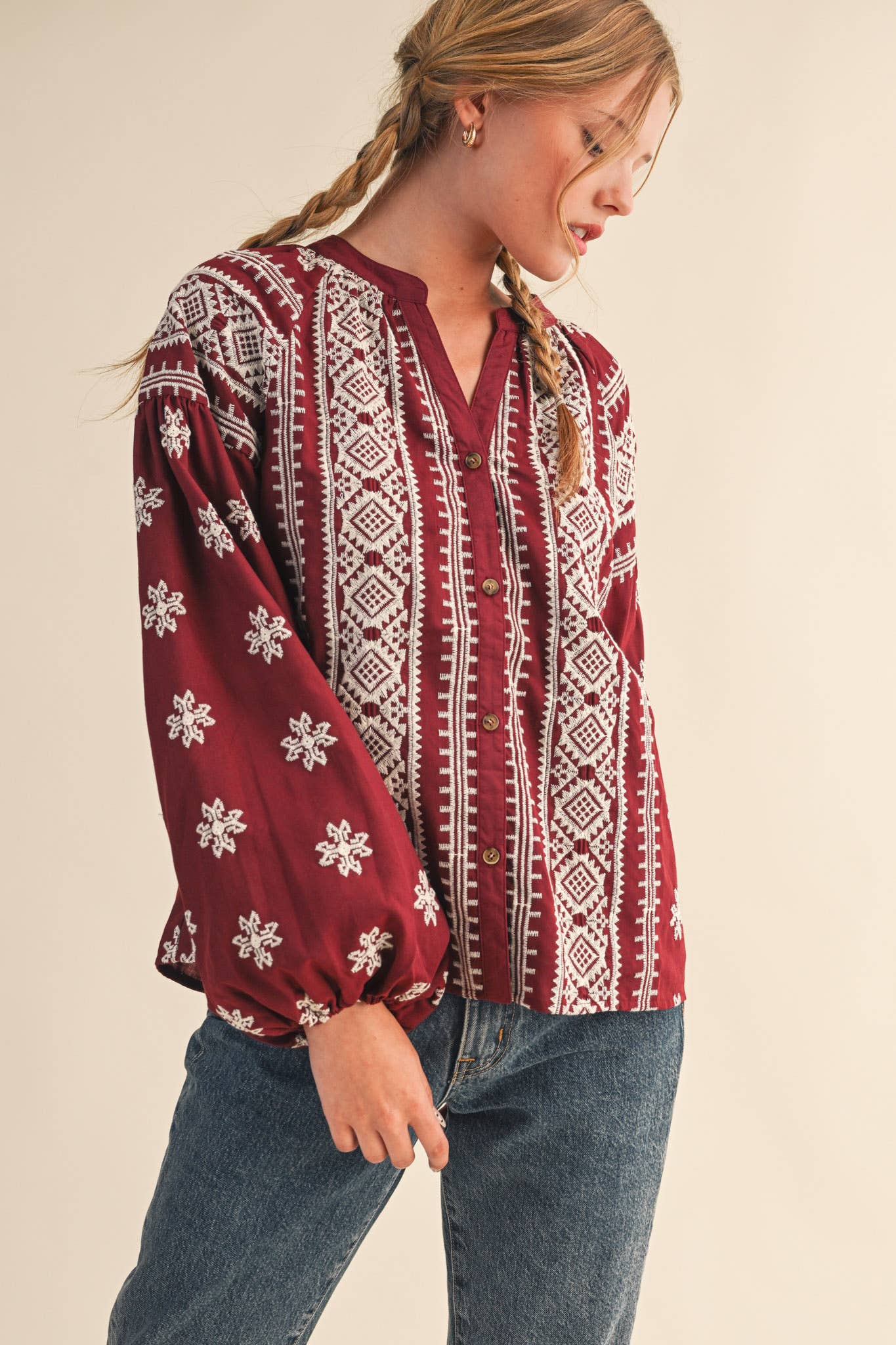 This embroidered bubble sleeve top is exactly what you need to live out the boho-chic season of your dreams! Woven fabric shapes this top that has billowing long bubble sleeves and a V neckline. Relaxed bodice with button placket creates a flattering fit, while all over geometric embroidery adds a unique finish!