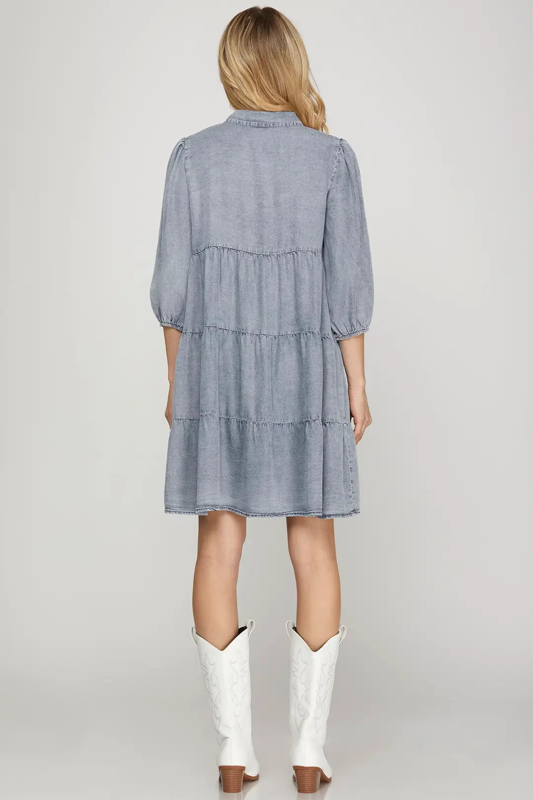 3/4 Sleeve Woven Washed Chambray Tiered Button Down Dress With Pockets in Light Blue