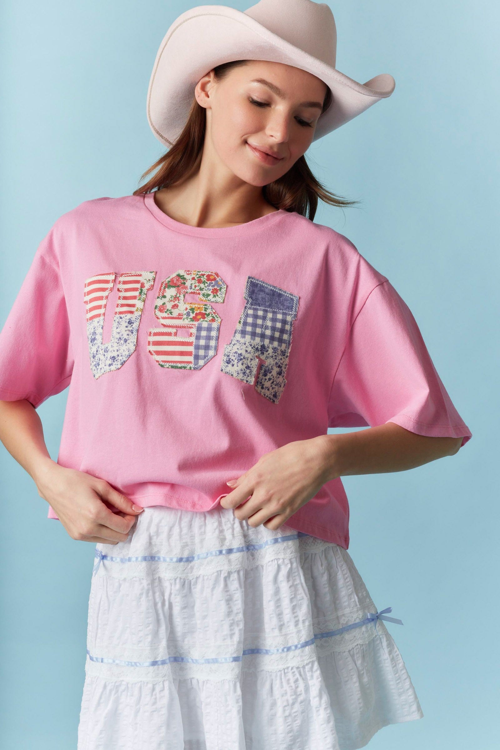 'USA' Patchwork Detail Cotton Short Sleeve Cropped Top