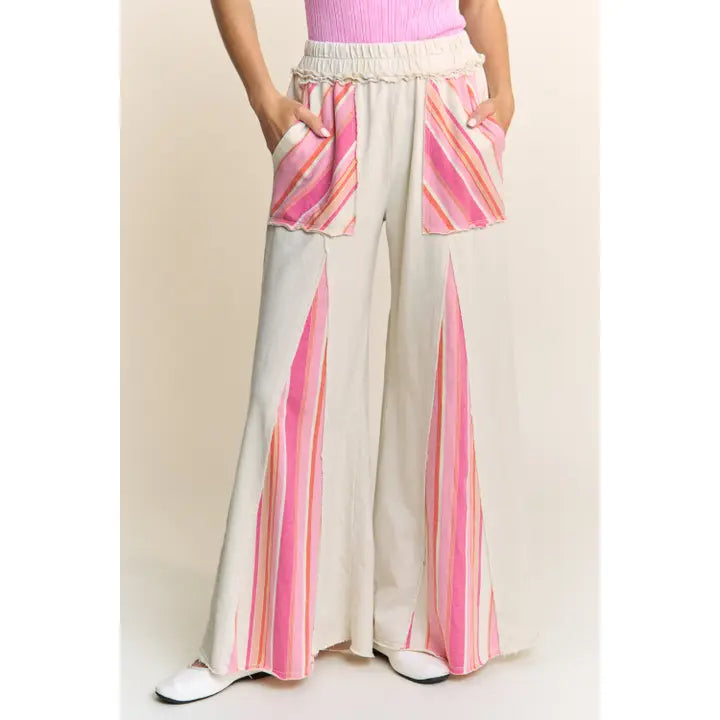 Mineral Washed Striped Detail Flare Pants in Pink and Tangerine