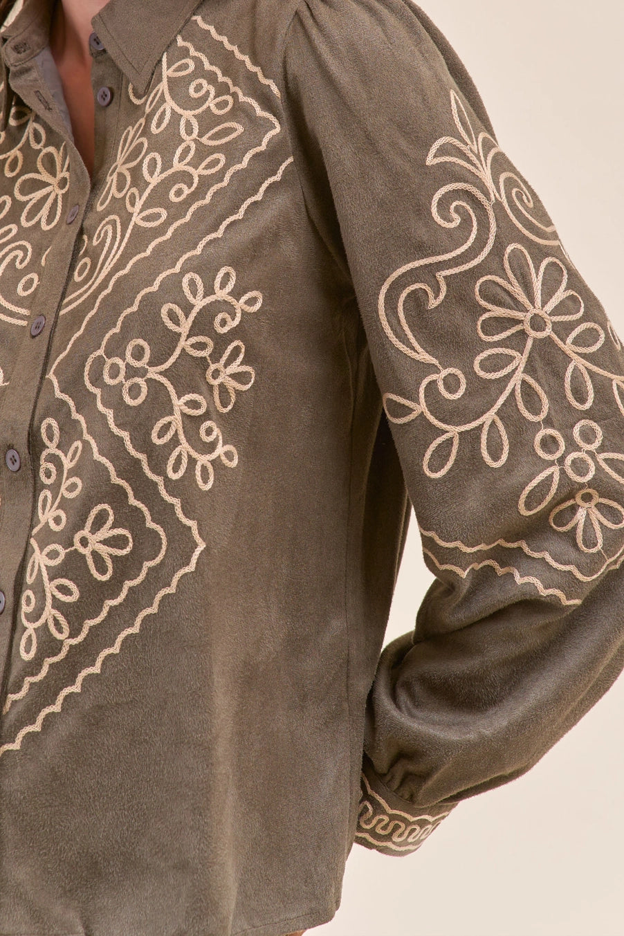 Suede Embroidered Button Up Top In Olive