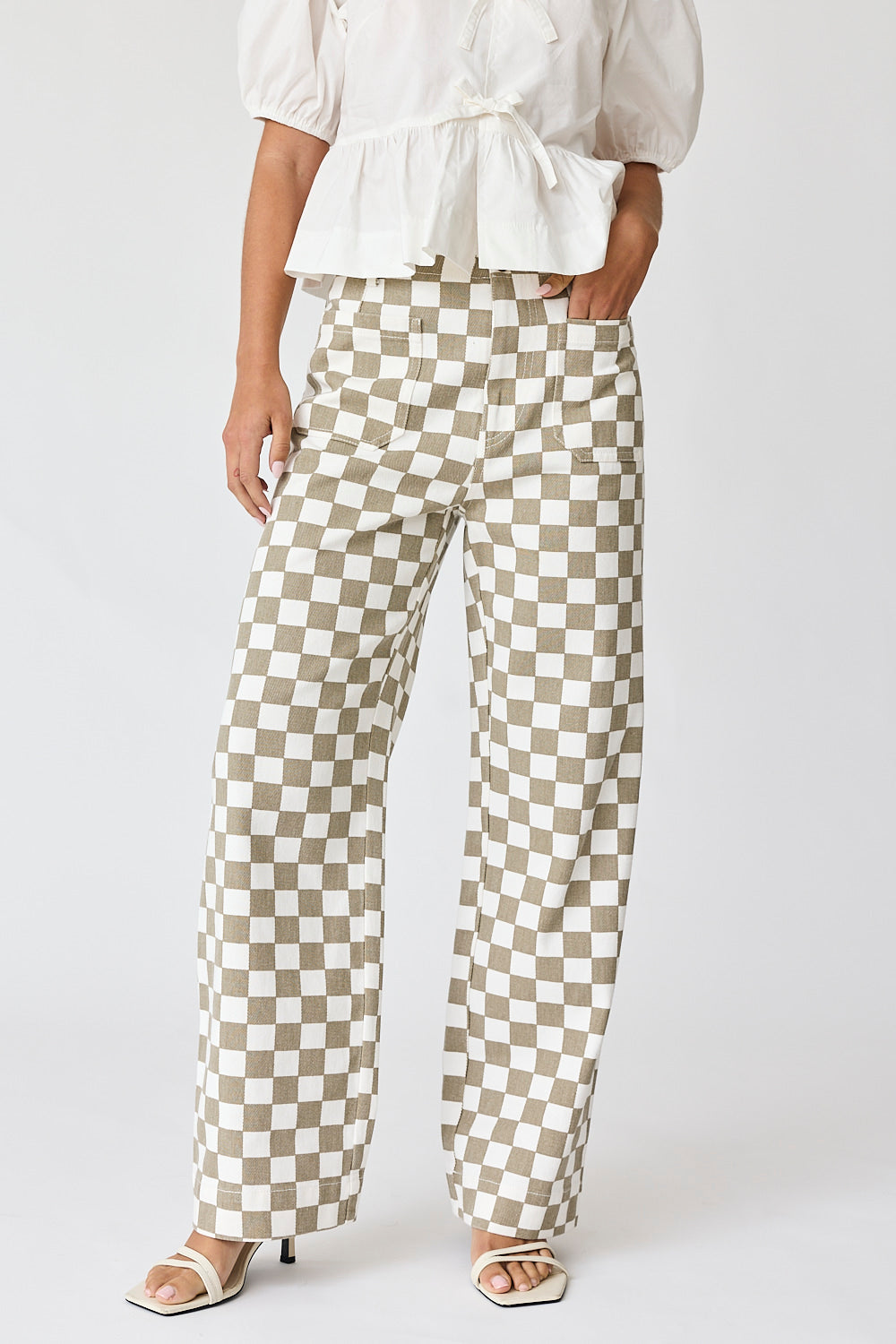 Taupe Checkered Game Day Pant - Elastic On Back Waistband