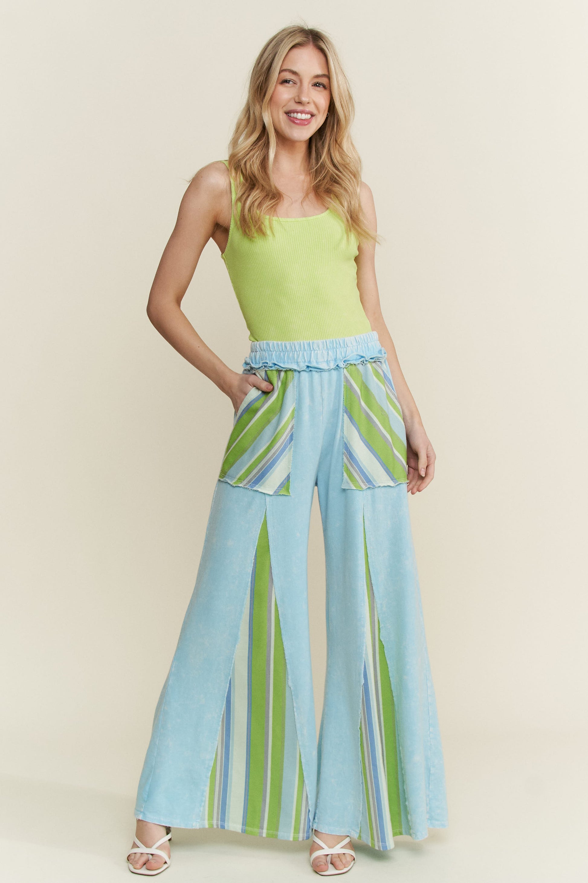 Mineral Wash Stripe Detail Wide Leg Pant in Blue and Lime